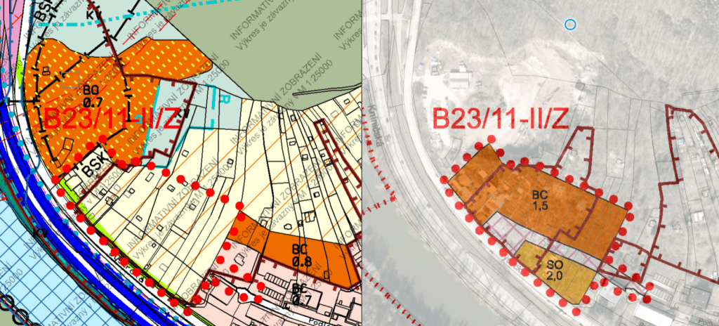 Oproti orientačnímu zákresu (v Obsahu změny) je řešené území mírně rozšířeno o východní výběžek nezbytný k propojení lokality s ulicí Podlesí.